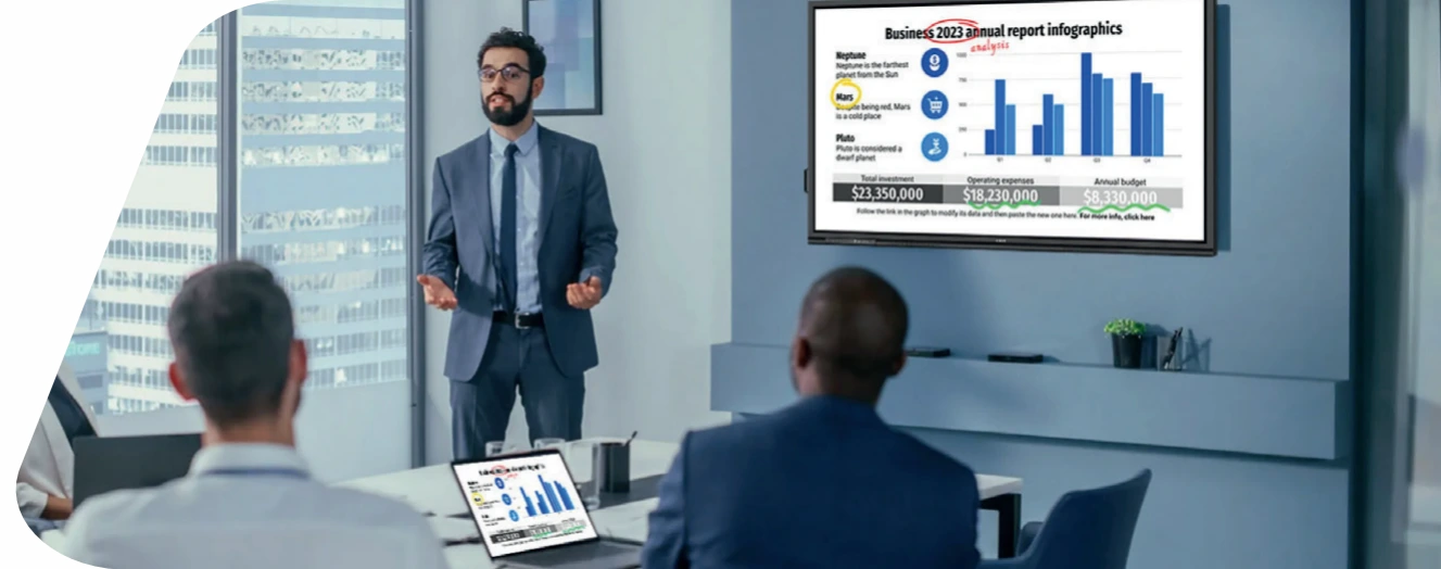 در محیط‌های اداری، پنل‌های تعاملی کلیک به عنوان ابزاری قدرتمند برای برگزاری جلسات، ارائه‌های حرفه‌ای و همکاری‌های گروهی عمل می‌کنند. با استفاده از نرم‌افزارهای پیشرفته و قابلیت‌هایی مانند انتقال داده با QR کد، شرکت‌کنندگان می‌توانند به سرعت اطلاعات را به اشتراک بگذارند. همچنین، امکان اتصال همزمان چندین دستگاه (تا ۷۰ دستگاه) به پنل، همکاری بین اعضای تیم را تسهیل می‌کند. این ویژگی‌ها باعث افزایش بهره‌وری و بهبود کیفیت جلسات می‌شود.